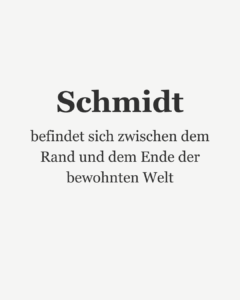 Schmidt ist eine literarische Figur, die mich seit 2024 begleitet – manchmal mit, meistens gegen meinen Willen. Schmidt passiert mir, wie anderen das Wetter. Schmidt ist da, und man kann nichts dagegen machen.