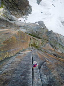 Zu dritt steigen wir zum Salbitbiwak auf, zu dritt in die erste Länge der „Via Hammerbruch“ (6b, 380m) ein und nur noch zu zweit in