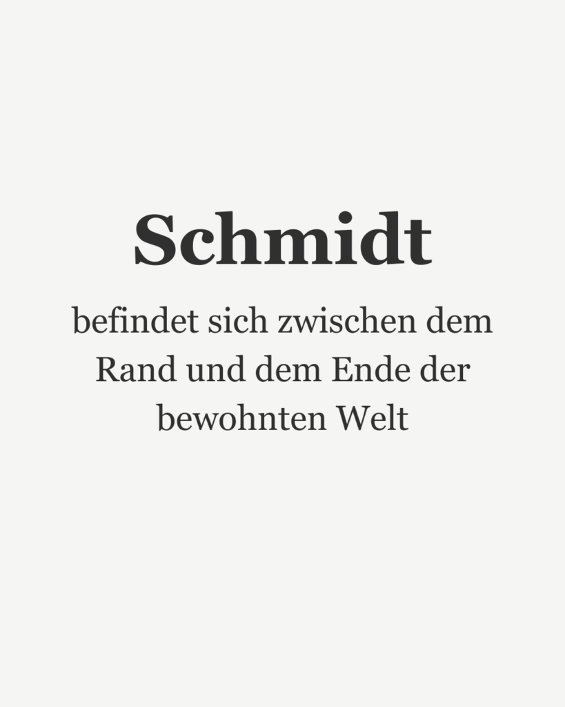 Schmidt ist eine literarische Figur, die mich seit 2024 begleitet – manchmal mit, meistens gegen meinen Willen. Schmidt passiert mir, wie anderen das Wetter. Schmidt ist da, und man kann nichts dagegen machen.