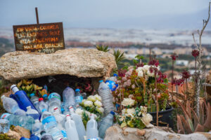 Der LKW-Fahrer schnickt seine Zigarette auf den Boden ohne sie auszudrücken. Er macht kehrt und wirft mir im Gehen einen Blick zu, um mich wissen zu lassen, dass er sich beobachtet fühlte. Als sein Laster schließlich hinter einer Kurve verschwindet, nähere ich mich dem Schrein. 126 Flaschen Wasser zähle ich, etwa 200 Liter. Vielleicht wäre Maria Correa hiermit bis zu ihrem Mann gekommen. Ich mache ein Foto des Schreins und versuche den Golfplatz mit ins Bild zu bekommen. 1982 kämpfte der knapp bekleidete Arnold Schwarzenegger dort unten am Strand als Conan der Barbar gegen Thulsa Doom, den Anführer des Schlangenkultes.