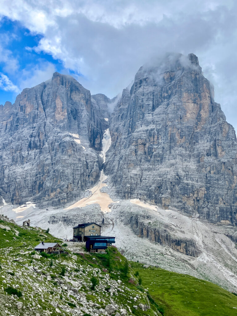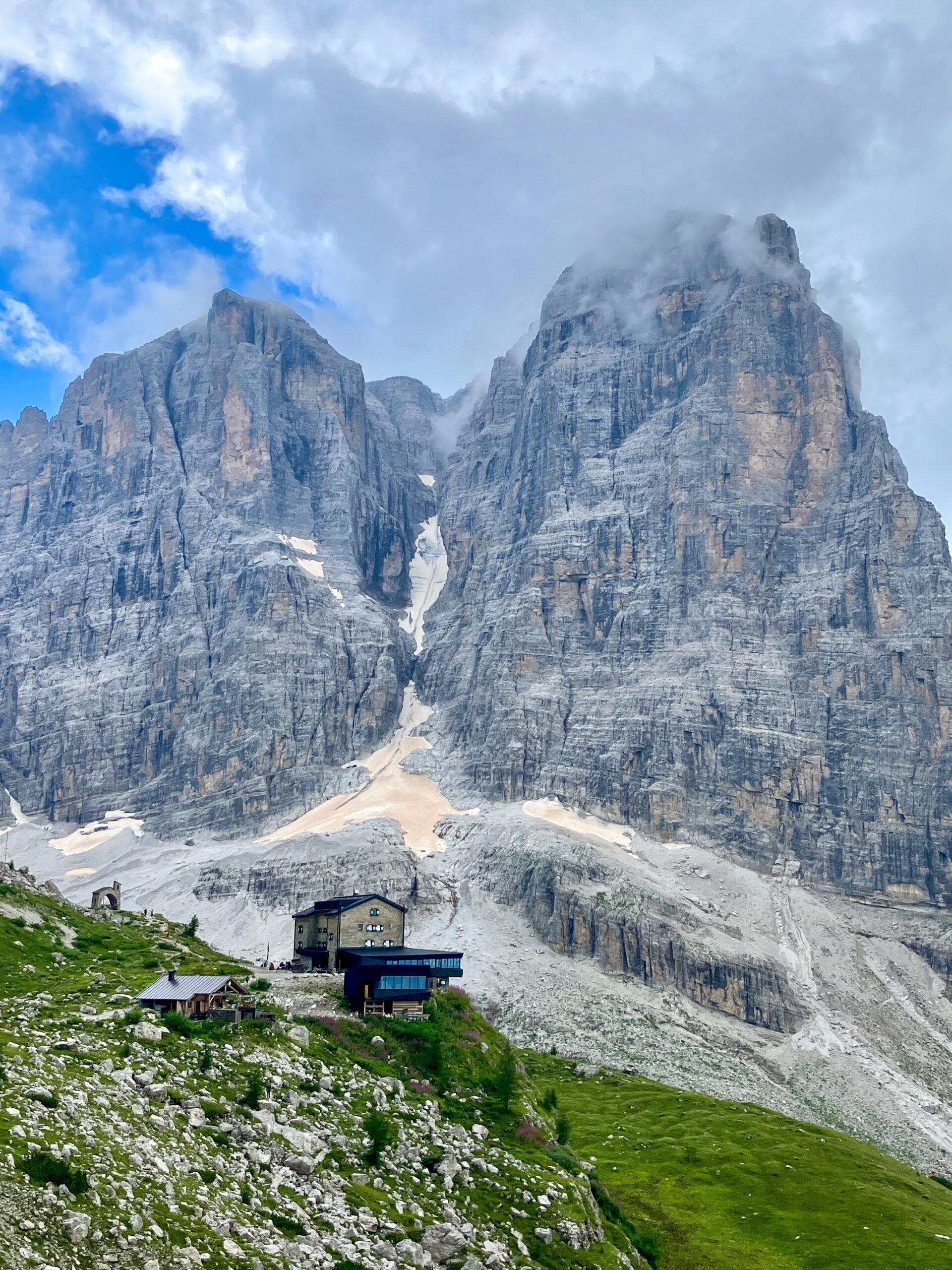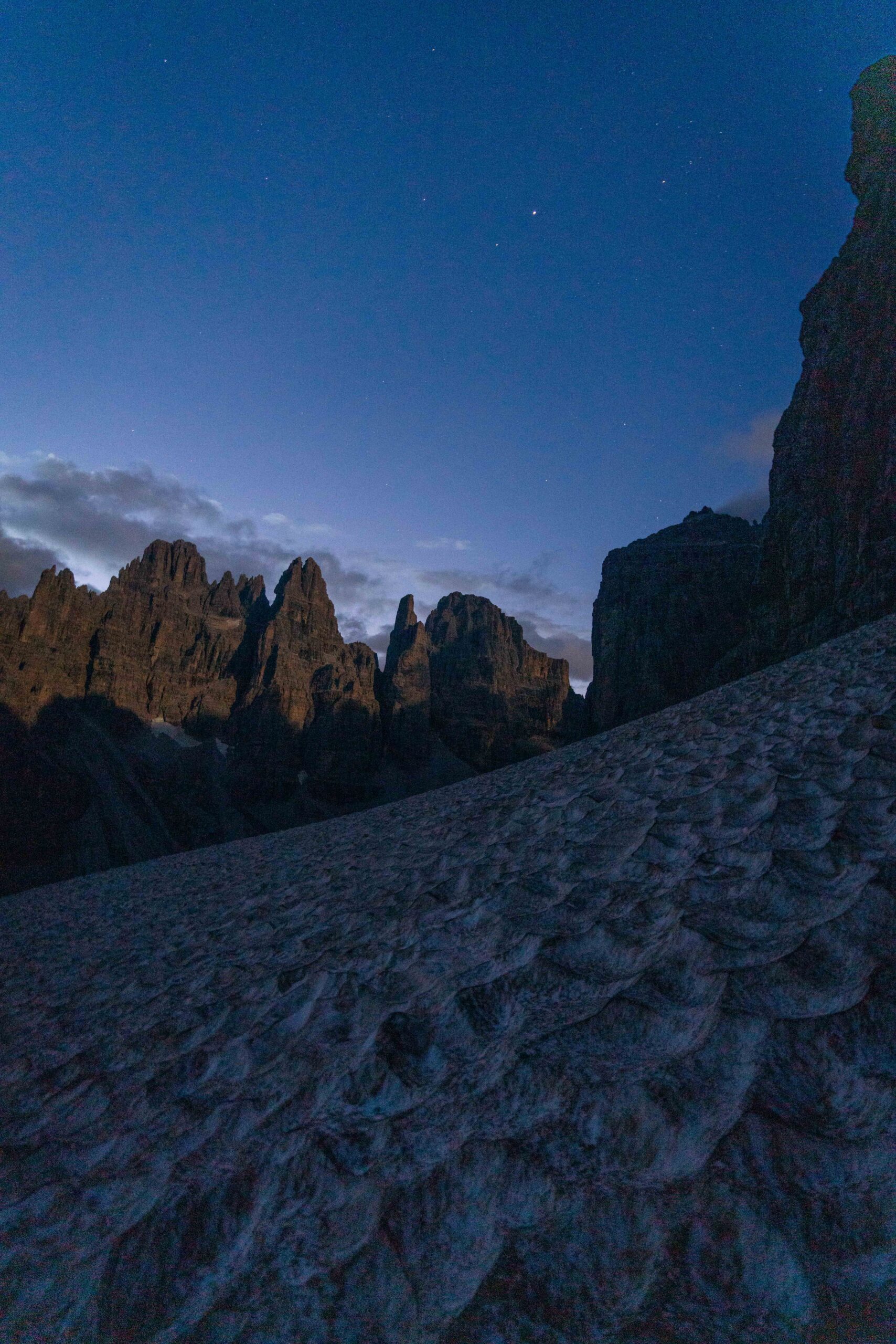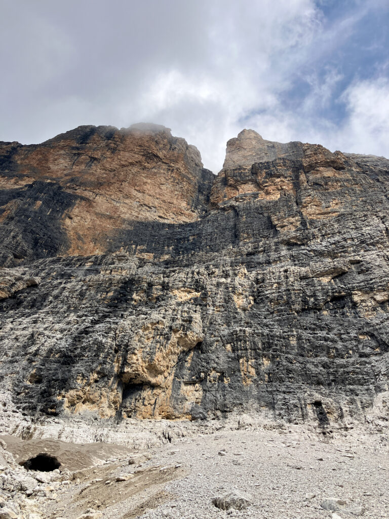 Der Crozzon di Brenta. Jene maßstabsprenge 800 Meter hohe Bastion, die über die (leider nicht mehr ganz so imposante) Eisrinne dramatisch zur Cima Tosa begrenzt wird. Eine nicht zu vergessende Ansicht, die uns schon als Jugendliche beim Blättern in den alten Pause-Büchern immer wieder gebannt hat. Im linken Wandbereich ziehen zwei markante Wasserstreifen naturgemäß lotrecht ihrer Wege, im rechten der beiden verläuft die „Via delle Guide“ (VI-, 800m, von Bruno Detassis 1935). Hervorragenden Fels von unten bis oben sollen wir hier finden, gute Absicherbarkeit, moderate aber anhaltende Schwierigkeiten, aufeinanderfolgende Bierhenkel en masse. Und all das finden wir auch.