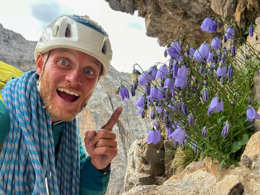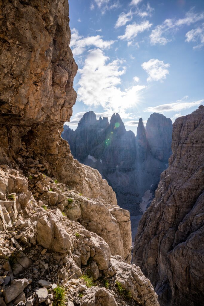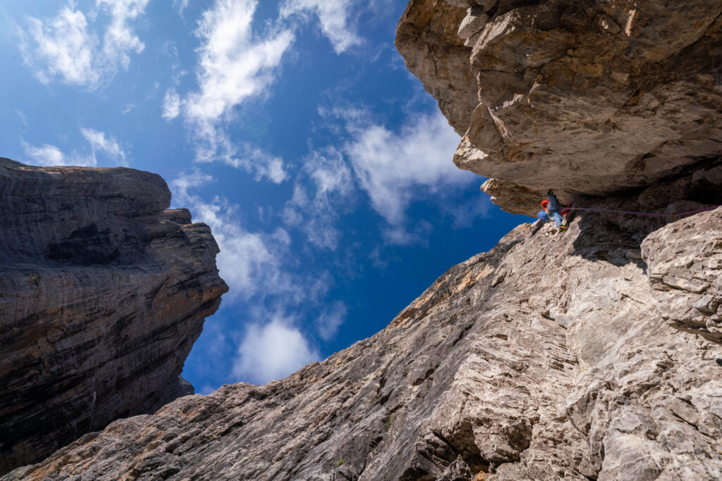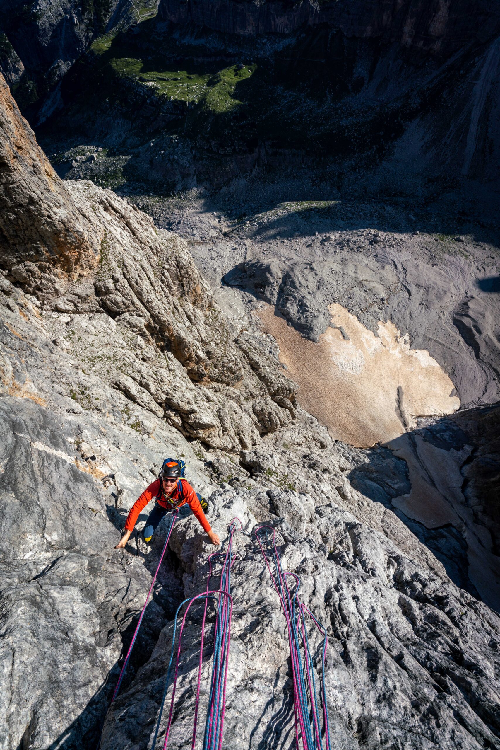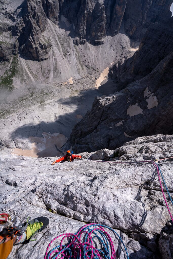 Wo gibt es das denn bitte? Einen solch hervorragenden Felsen über diese enorme Wandhöhe? Wo sonst immer mal wieder einige Schrofen oder Trash-Längen zu klettern sind, geht es hier Seillänge für Seillänge wieder über beste Kletterstellen. Sogar die Sonne begleitet uns in der Nordostwand und das schmale Fundament des Campanile Basso (bzw. der Guglia di Brenta) steht uns lockend im Rücken.