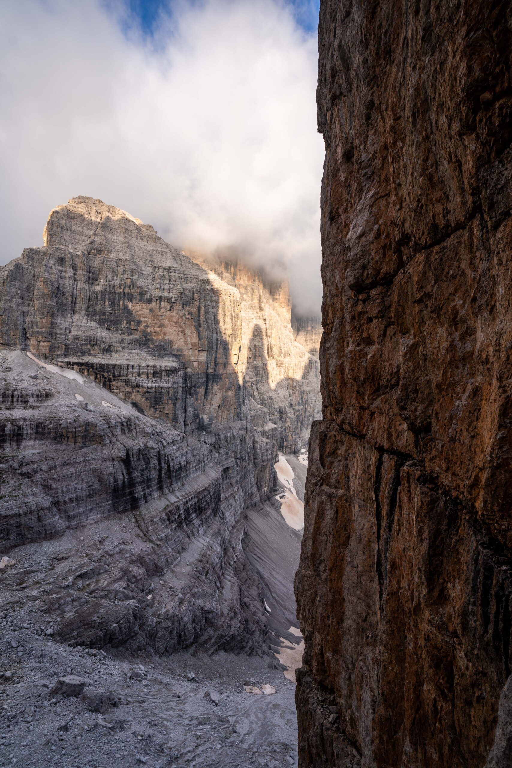 Hell doch fahl erleuchtet liegt das Val Brenta Alta vor uns, das wir bei Nacht und ohne Stirnlampen durchmessen. Zu unserer Rechten erheben sich Crozzon di Brenta und Cima Tosa, in deren Wänden sich nach wie vor eine Seilschaft befinden muss, deren Lampenschein wir am Abend noch gesehen und die den Weg hinunter offenbar nicht mehr gefunden haben. Schweigend nähern wir uns unserem Ziel; zu ehrfürchtig begegnen wir der Stille, die zu stören wir fürchten. Vielleicht sind wir aber auch einfach noch müde. Nicht, dass Wetter oder Zeit pressiert, aber wir sind beim Klettern gerne alleine. Und haben das frühe Aufstehen noch nie bereut.