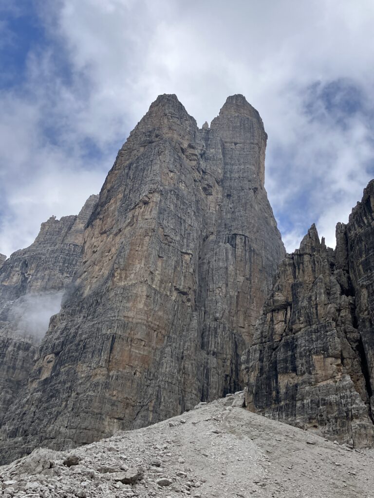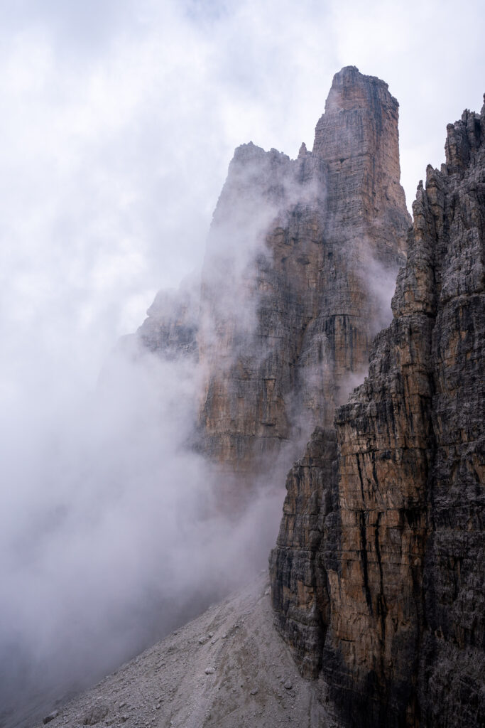 In mystisches Nebelkleid hüllt sich unser Turm beim Abstieg. Und wir fragen uns nicht zum ersten Mal: Droht da schon Gewitter oder sind das bloß Brenta-Nebel?