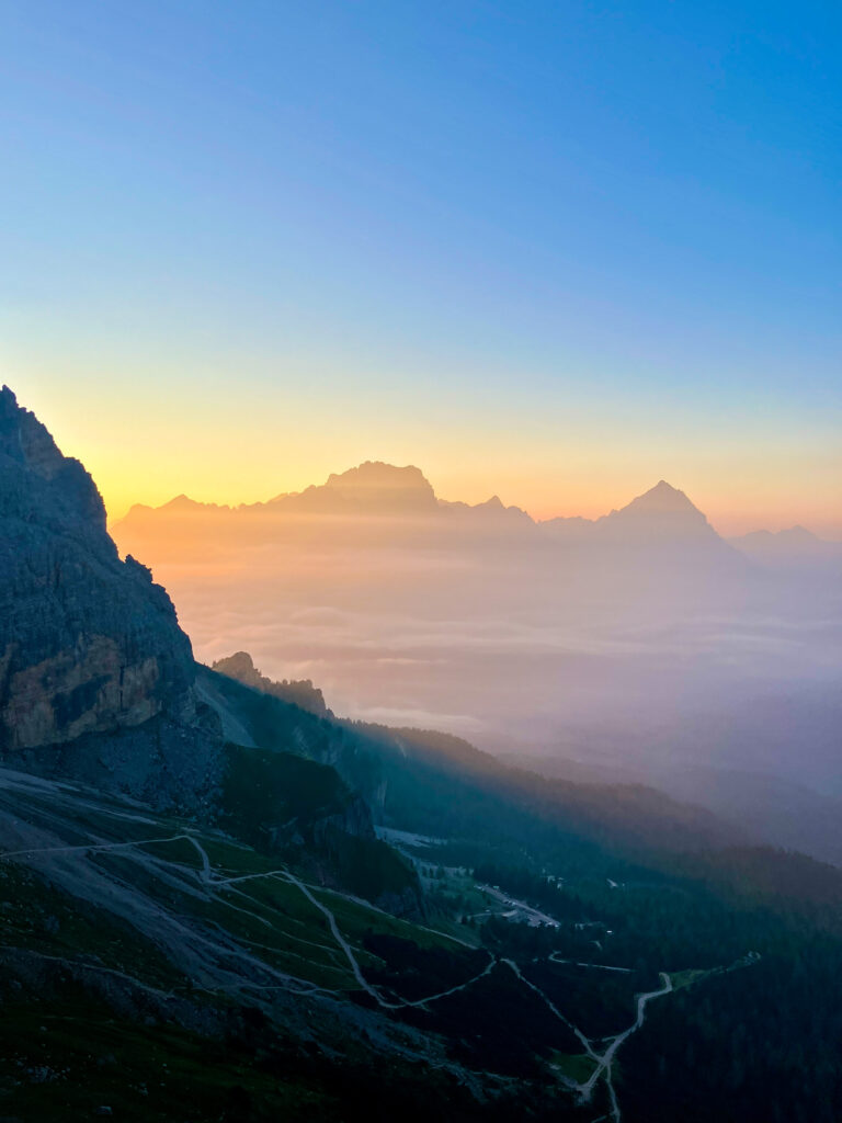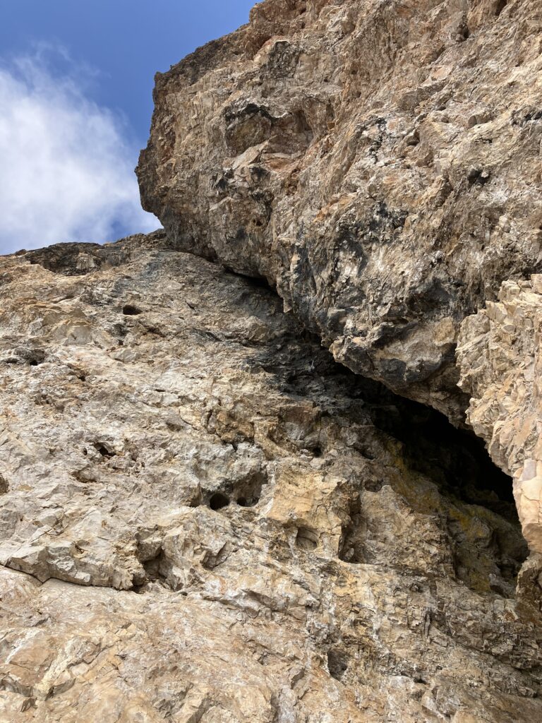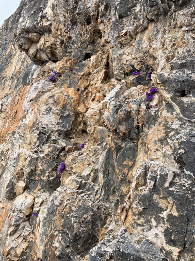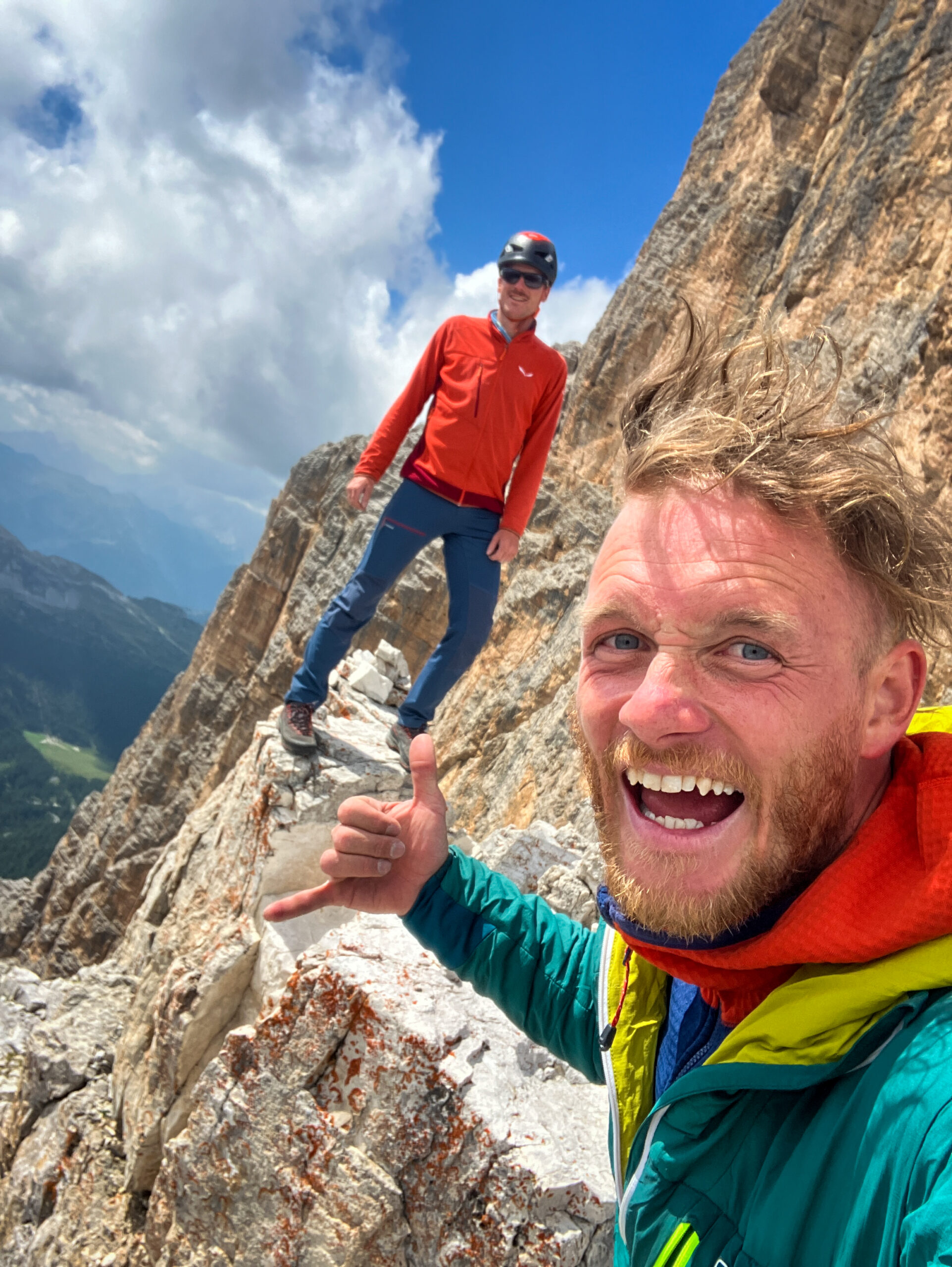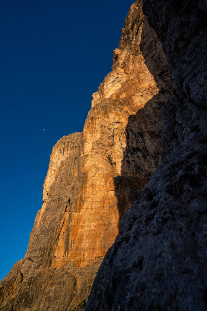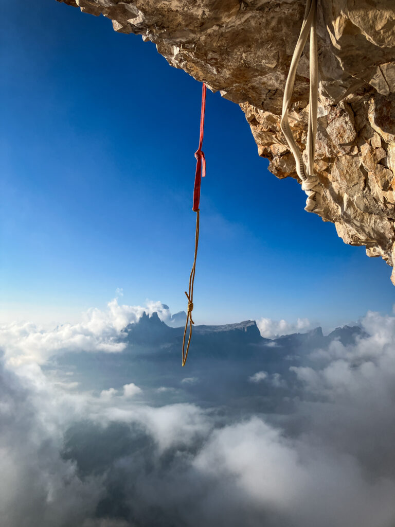 Wir klettern die klassischen Südostrisse des 2. Pfeilers der Tofana di Rozes, bzw. die „Constantini-Apollonio“ (7+ bzw. 6+ A0) — und es ist der größte Genuss. Die Kletterei ist durchweg erstaunlich hervorragend, auch wenn die Dächer ruppig (aber A0 gut lösbar bzw. durch Cams gut absicherbar) sind. Hier stecken mittlerweile auch vier Bohrhaken. Die steile Zwischenlänge ist ein Highlight für sich und selbst die letzten Kamine sind spannend bis zum Schluss. Auch der gefürchtete überhängende Risskamin des „Maultierrückens“ ist nicht ganz so gruselig wie man meint; zumindest, solange der ausdauernde Holzkeil die Sache noch mitmacht. Auf dem darunter ziehenden Biwakband findet sich das vielleicht größte Wunder der Tour: Ein stattlicher Busch nährt sich seit Ewigkeiten von allem hier herunterfließenden Wasser (bzw. leider auch den Überresten magengequälter Kletterer).