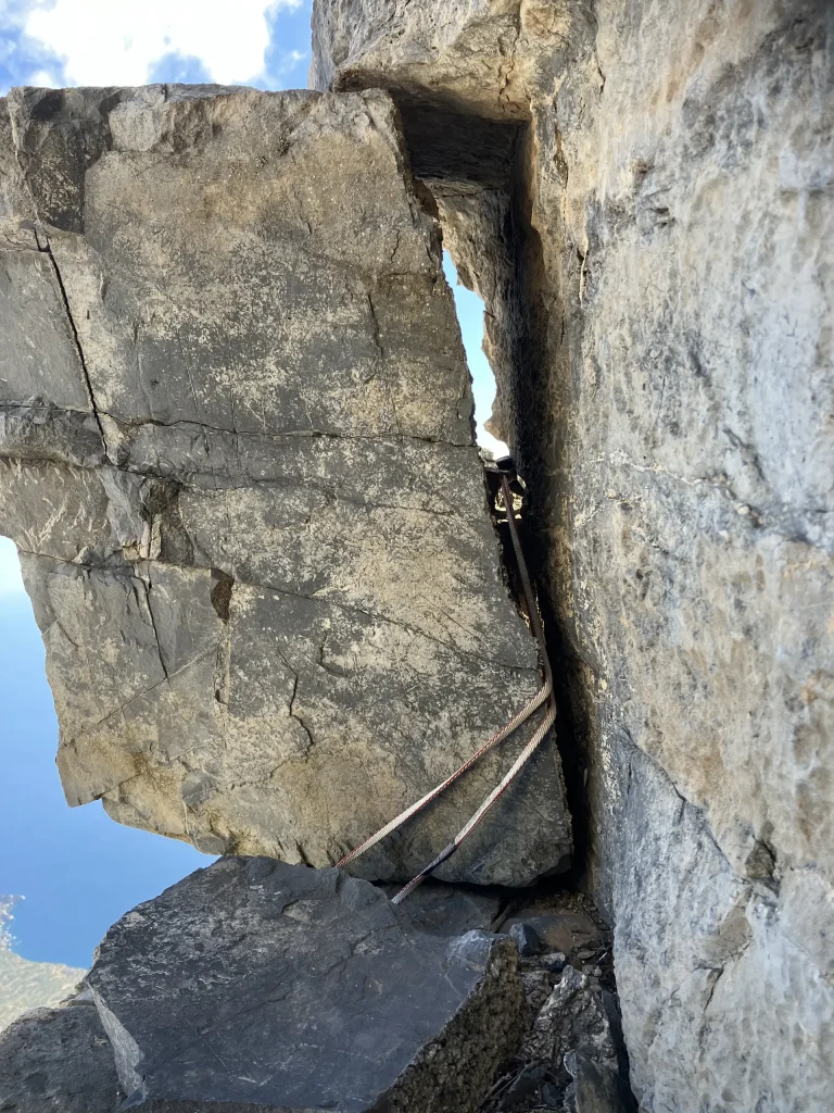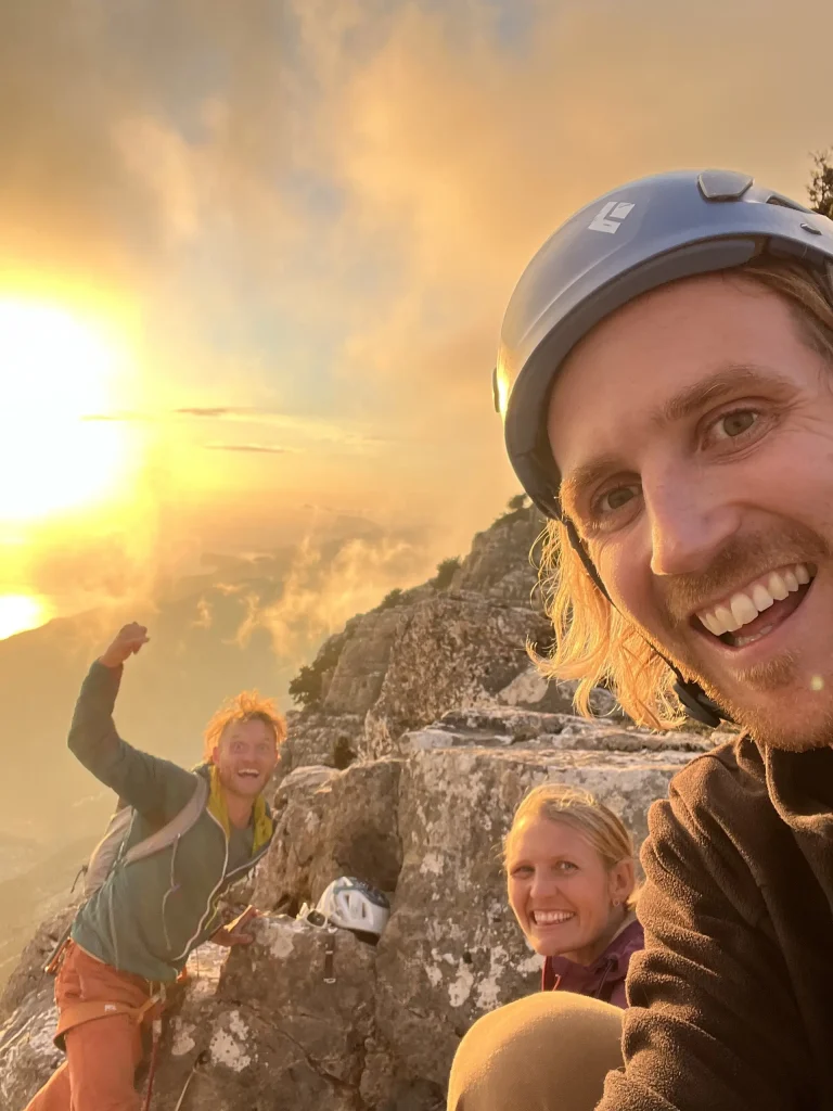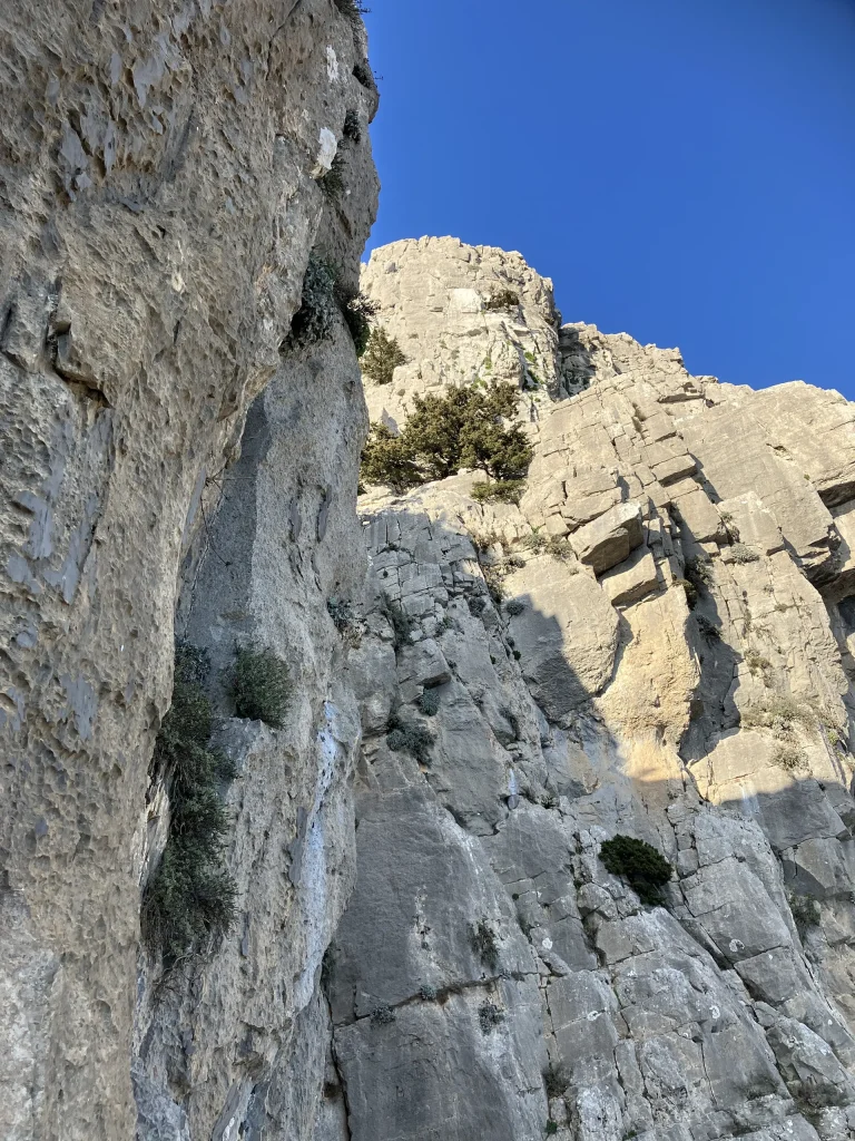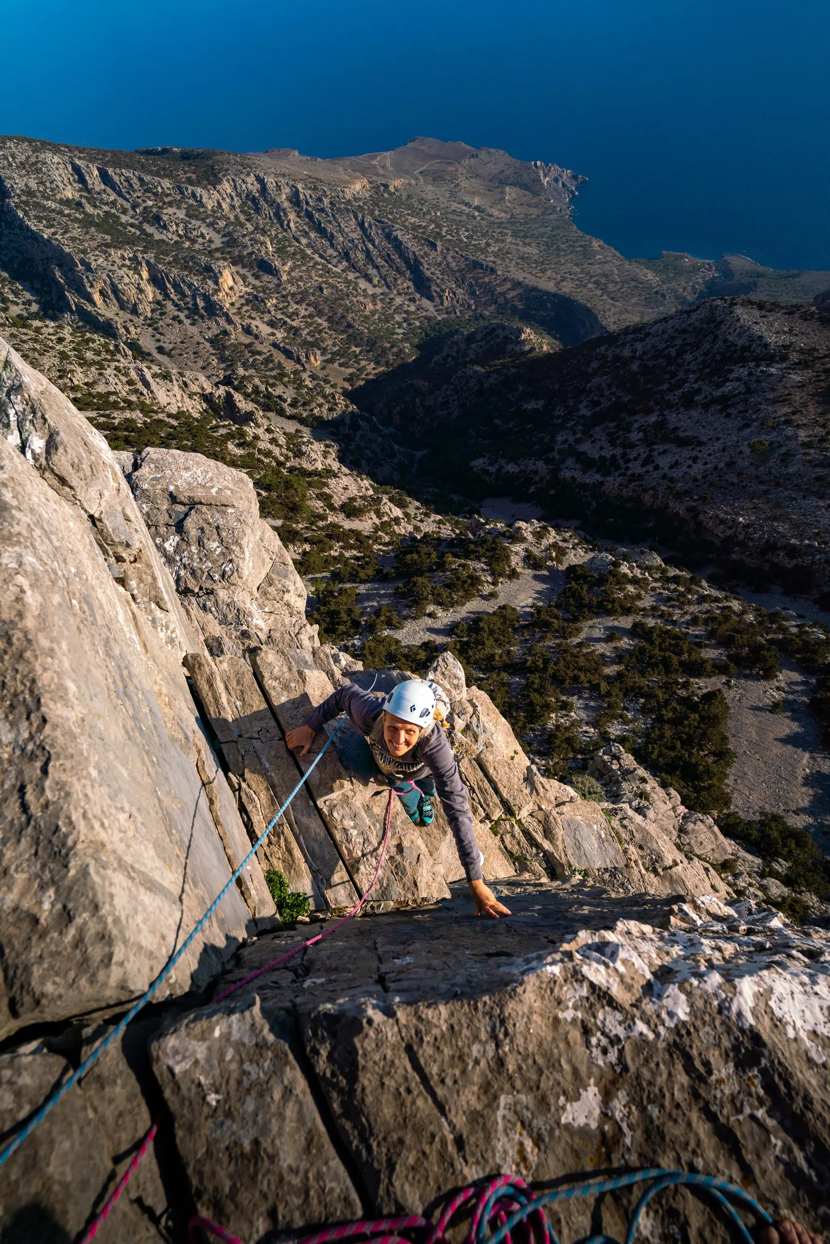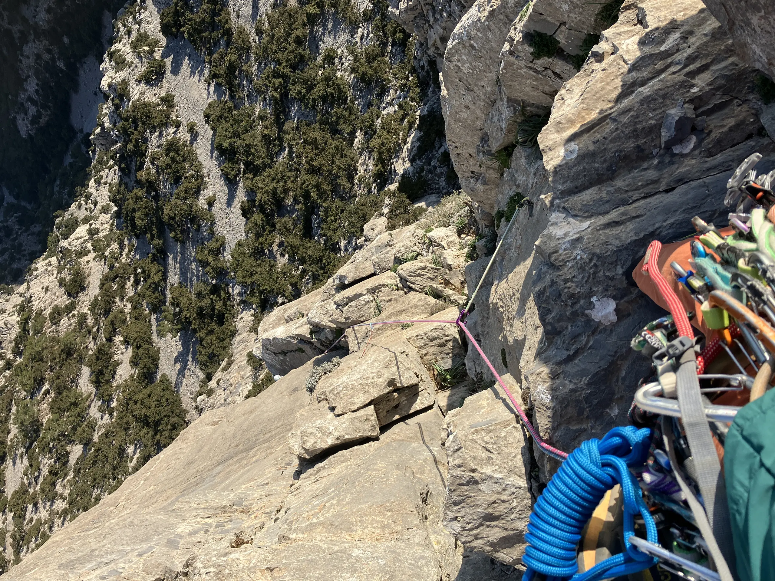 Ich habe das Glück Julie & Lenni kennengelernt zu haben, die einzigen Kletternden, die mir auf Kreta begegnen sollten. Sie haben Lust auf ein Abenteuer, hörten von der 200m abbrechenden Südseite des Kofinás, der höchsten Erhebung des Asterousia. Sie haben sogar ein Foto mit einer windig eingezeichneten Linie darauf, die mit „Topo“ überschrieben ist. Wir finden noch den Namen „Pilgerweg“ und den Grad „5b“, das war’s dann mit den Informationen. Was folgt, ist ein herrlich freier Tag im freien Gelände; wir finden sogar ganze fünf Schlaghaken. Wie viele Seilschaften hier wohl im Jahr unterwegs sind? Viele können es nicht sein, dafür klemmt dann doch zu reichlich veränderungsfreudiges Gestein in der Route. Sonstige Begehungsspuren (geschweige denn einen Einstieg) gibt es hier nicht.